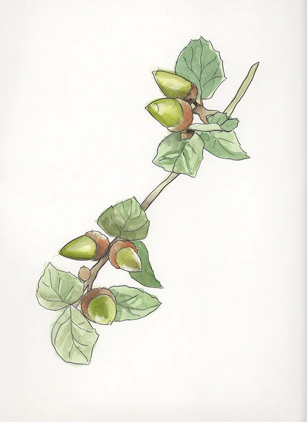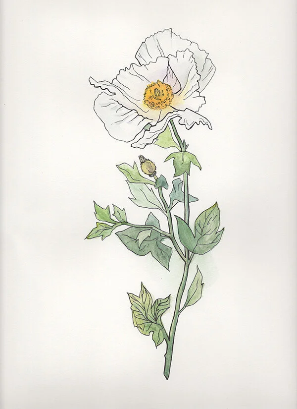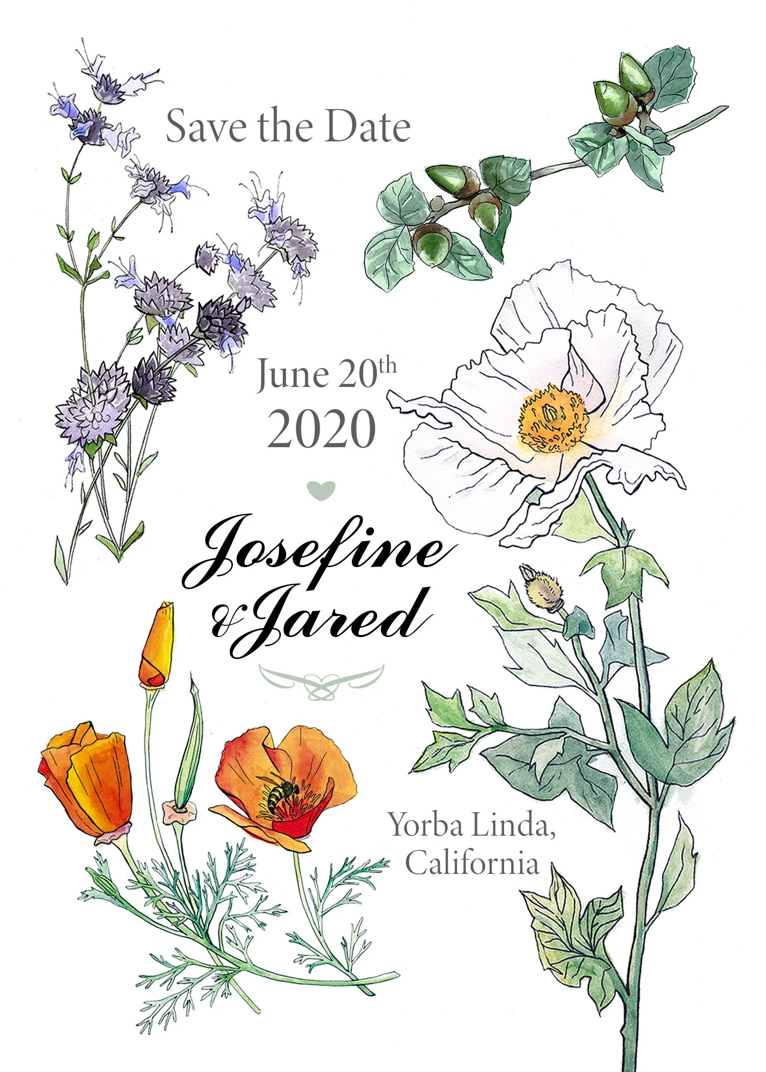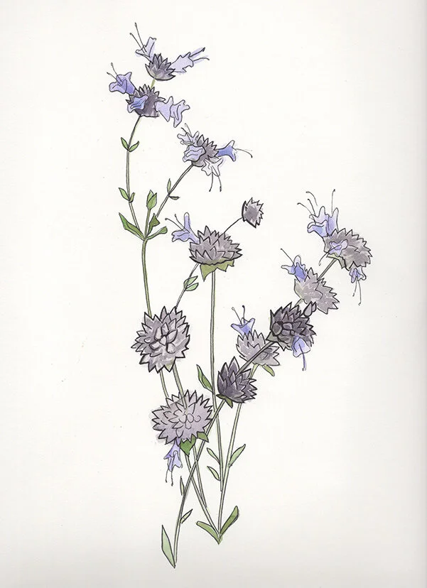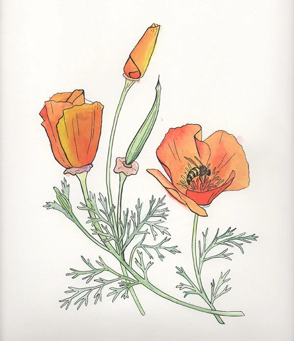 These card designs are inspired by scientific botanical drawings and feature different California native plants. All of the pen and watercolor drawings are drawn from plants growing in our backyard, from life and from photography, then scanned in and assembled in Photoshop.